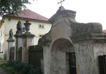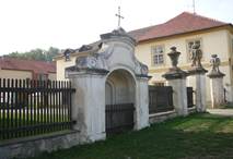 Symetrické pilířové ohrazení s výklenkovými kapličkami je situováno v úrovni hlavního průčelí domu čp. 112. Při V a Z straně domu je vjezdová pilířová brána zakončená skulpturami válečných trofejí. Pilíře s projmutými rohy vrcholí profilovanou římsou. Laťkový plot se dále na V a Z pojí k samostatnému pilíři s vázou ve vrcholu. Obě strany oplocení zakončuje výklenková kaplička. Zděnou omítnutou kapli člení pilastry s římsovými hlavicemi, výklenek zaklenutý půlkruhovým obloukem (u Z kaple s druhotně prolomeným vstupem) a štítový nástavec blížící se trojúhelnému tvaru se stlačenými volutovými křídly, segmentovou profilovanou římsou a dvouramenným křížkem ve vrcholu na V straně je na zadní straně vyboulená.