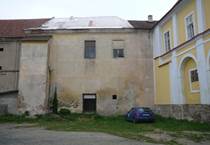 Zděná čtyřpodlažní budova špýcharu obdélníkového půdorysu stojí při zámecké budově na SV straně (ve svažitém terénu). V J koutě při V křídle zámku byla ještě v barokní době upravena na dvoupodlažní obytnou část (s hladkou vápennou omítkou, ve V průčelí o čtyřech osách, v Z o dvou osách, s profilovanou korunní římsou a oplechovanou sedlovou střechou s valbičkou). Samotná stavba špýcharu je opatřena hrubě hozenou omítkou v kombinaci s hladce omítnutými plochami lisén a pilastrů. Člení ji sokl, kordonová římsa, obdélné větrací otvory v pravidelném odstupu bez šambrán a profilovaná korunní římsa. Zvalbenou střechu kryjí bobrovky. Uprostřed střechy vystupuje novodobý větrací nástavec krytý eternitem. K S průčelí špýcharu přiléhá hospodářská budova. Do budoucna je třeba sjednotit střešní krytinu a hlavní budovou zámku.