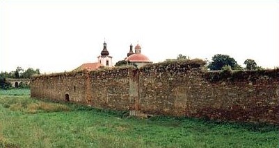 Pohled na zeď ze severní (zadní) strany. V pozadí za zdí vystupuje kostel sv. Anny a je též vidět střecha a věže konventu. Vzadu úplně nalevo jsou vidět pozůstatky chotkovského zahradního divadla.