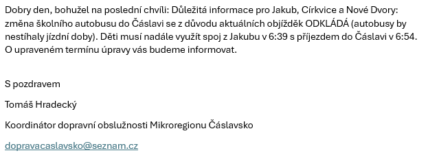 Důležitá informace pro Jakub, Církvice a Nové Dvory: změna školního autobusu do Čáslavi se z důvodu aktuálních objížděk ODKLÁDÁ (autobusy by nestíhaly jízdní doby). Děti musí nadále využít spoj z Jakubu v 6:39 s příjezdem do Čáslavi v 6:54.