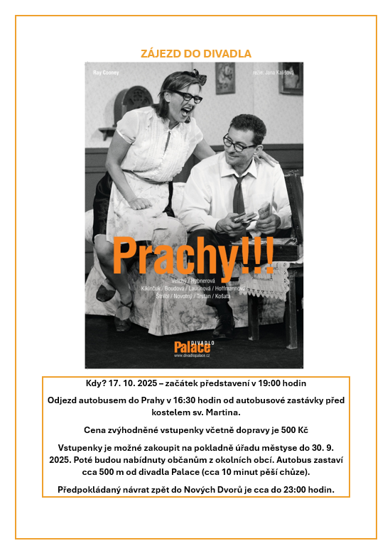 Městys Nové Dvory zve všechny občany na zájezd na divadelní představení PRACHY!!! - 17.10.2025